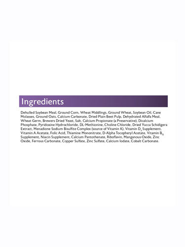 Dehulled Soybean Meal, Ground Corn, Wheat Middlings, Ground Wheat, Soybean Oil, Cane Molasses, Ground Oats, Calcium Carbonate, Dehydrated Alfalfa Meal, Dried Plain Beet Pulp, Ground Flaxseed, Wheat Germ, Brewers Dried Yeast, Dicalcium Phosphate, Salt, Calcium Propionate (a preservative), DL-Methionine, Choline Chloride, Pyridoxine Hydrochloride, Yucca schidigera Extract, Vitamin A Acetate, Menadione Sodium Bisulfite Complex (Vitamin K), Cholecalciferol (Vitamin D3), Folic Acid, Thiamine Mononitrate, Manganous Oxide, d-Alpha Tocopheryl Acetate (Vitamin E), Vitamin B12 Supplement, Zinc Oxide, Ferrous Carbonate, Nicotinic Acid, Calcium Pantothenate, Riboflavin Supplement, Copper Sulfate, Zinc Sulfate, Calcium Iodate, Cobalt Carbonate.